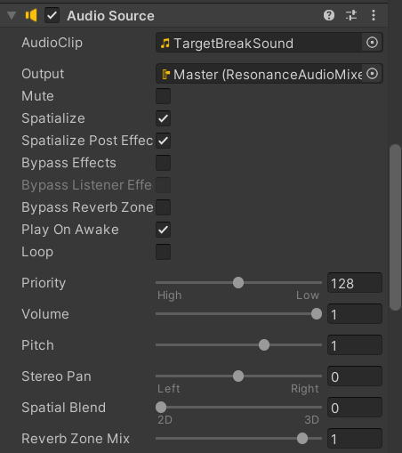 While we were able to incorporate sound, it unfortunately did not come out spatialized. We will go over the process here, as well as any potential reasons for the issues. We decided to try the Google Resonance Audio library. This library is compatible with various platforms and is open source. We decided to utilize this because it would allow us to potentially build for more platforms and devices. This library builds on top of Unity’s built in Audio system. To create a basic sound effect, we need two elements, an Audio Source and an Audio Listener. These two parts correspond to two Unity components of the same name. The Audio Source contains the actual sound effect information and the Audio Listener contains configurations as to how the sound will be received. We placed the Audio Source on the particle system that spawns from breaking the target. Below is an image of the audio source configuration: