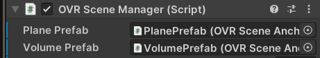 The cubes and targets we’ve spawned in part 1 were spawned independently of the scene information. We wanted to attempt to create spawns that depended on scene information. The way to do this was to create a Prefab Override in our OVR Scene Manager. Previously, we’ve only had two prefabs: one for flat planes and one for furniture. These are defined in the Scene Manager component as scene below: